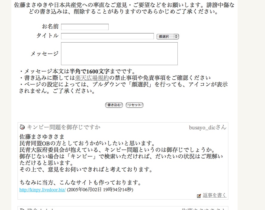 2005年06月21日 (きょうの赤旗)「大運動」1 若い世代の経験を交流 県青年・学生担当三役会開く 党機関と民青同盟が取り組んだ新入生歓迎運動の経験が豊かに交流された。 注目は二番目に出てくる事例の民青岡山と石川金沢地区地方議員と青年の毎月青年デーなどのとりくみ。きしくも、この二つは、3週間前に当委員会がネット掲示板で質問した民青や党役員のいる地域なのが注目される。 まずは民青同盟岡山県委員会の掲示板 クリックすると拡大します。 http://tcup7000.at.infoseek.co.jp/lovelife/bbs
