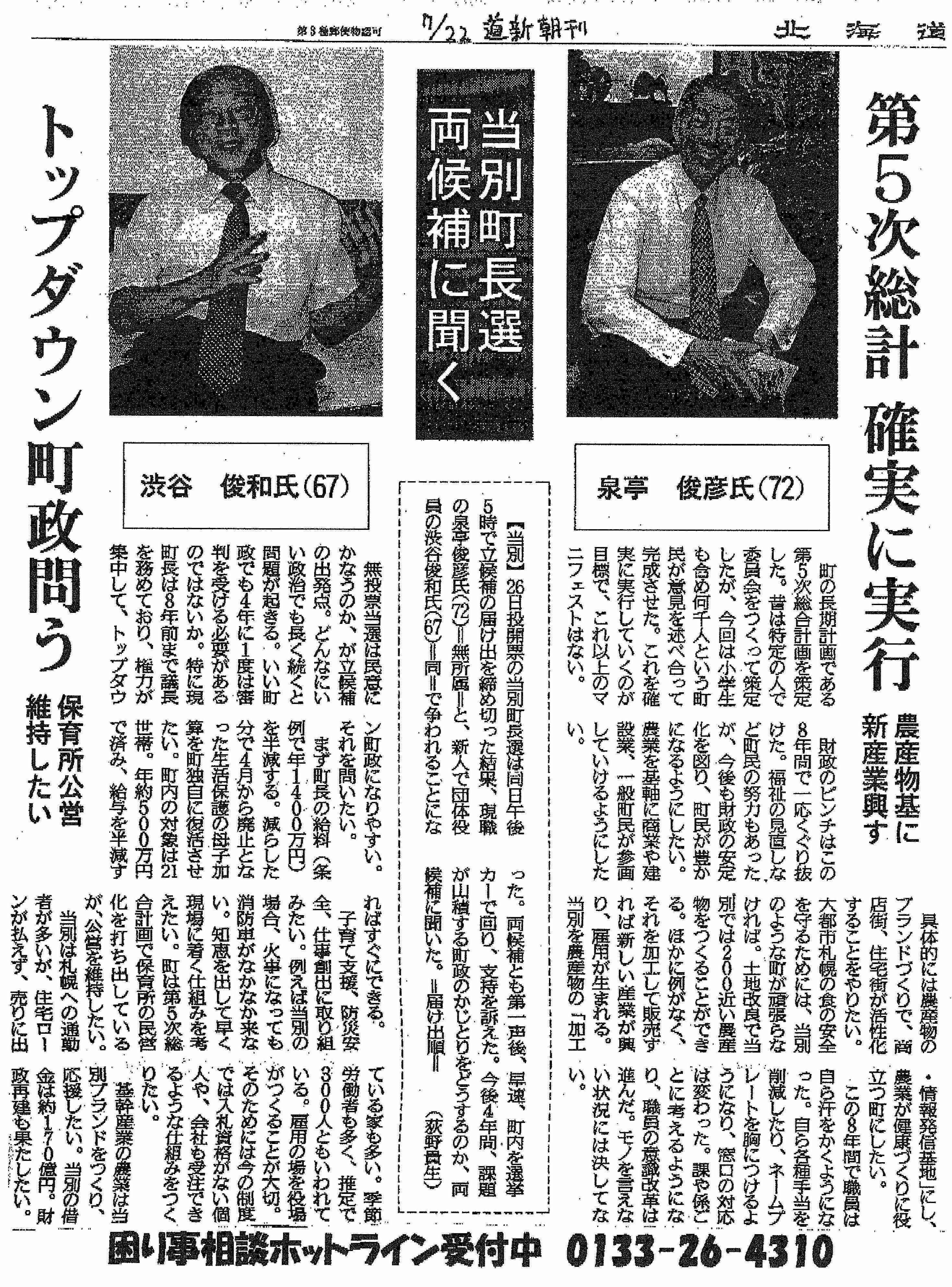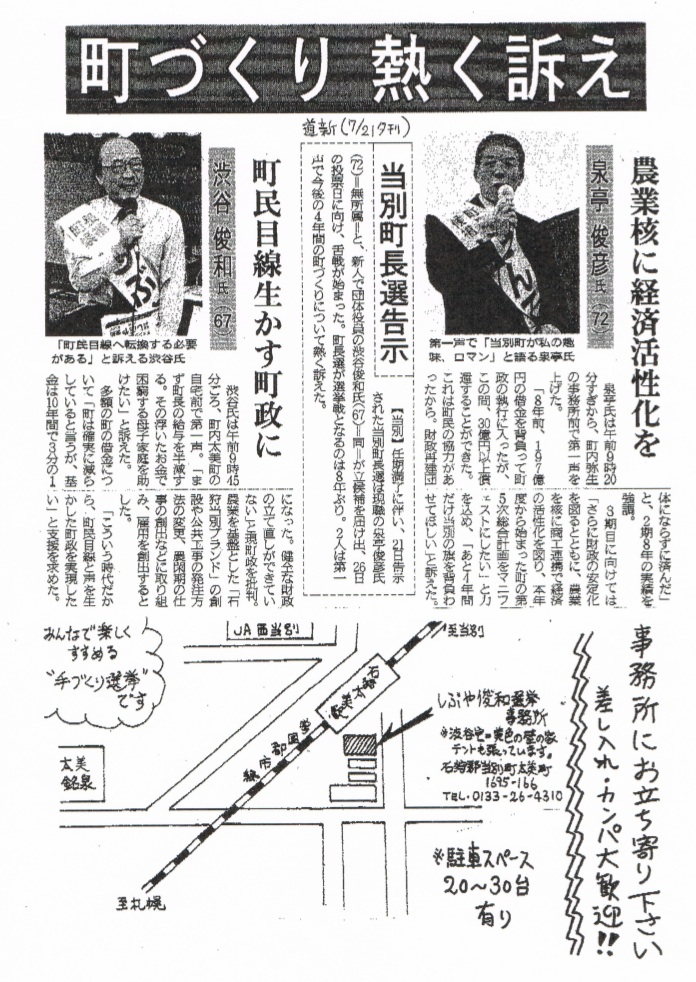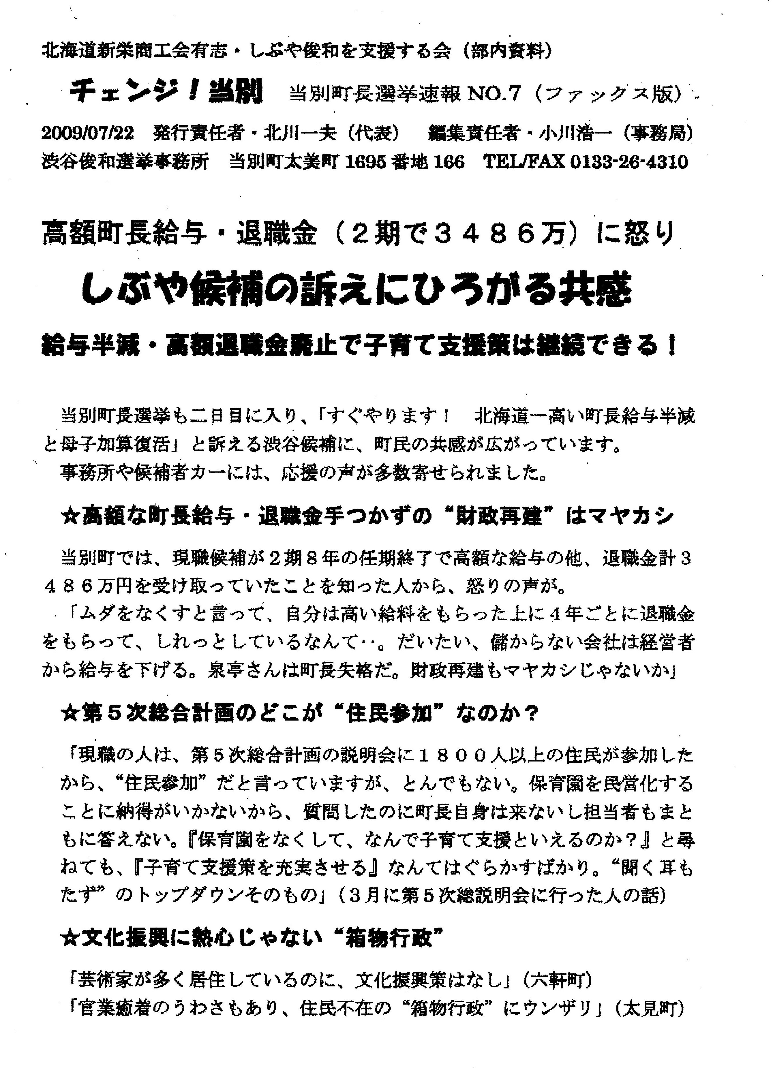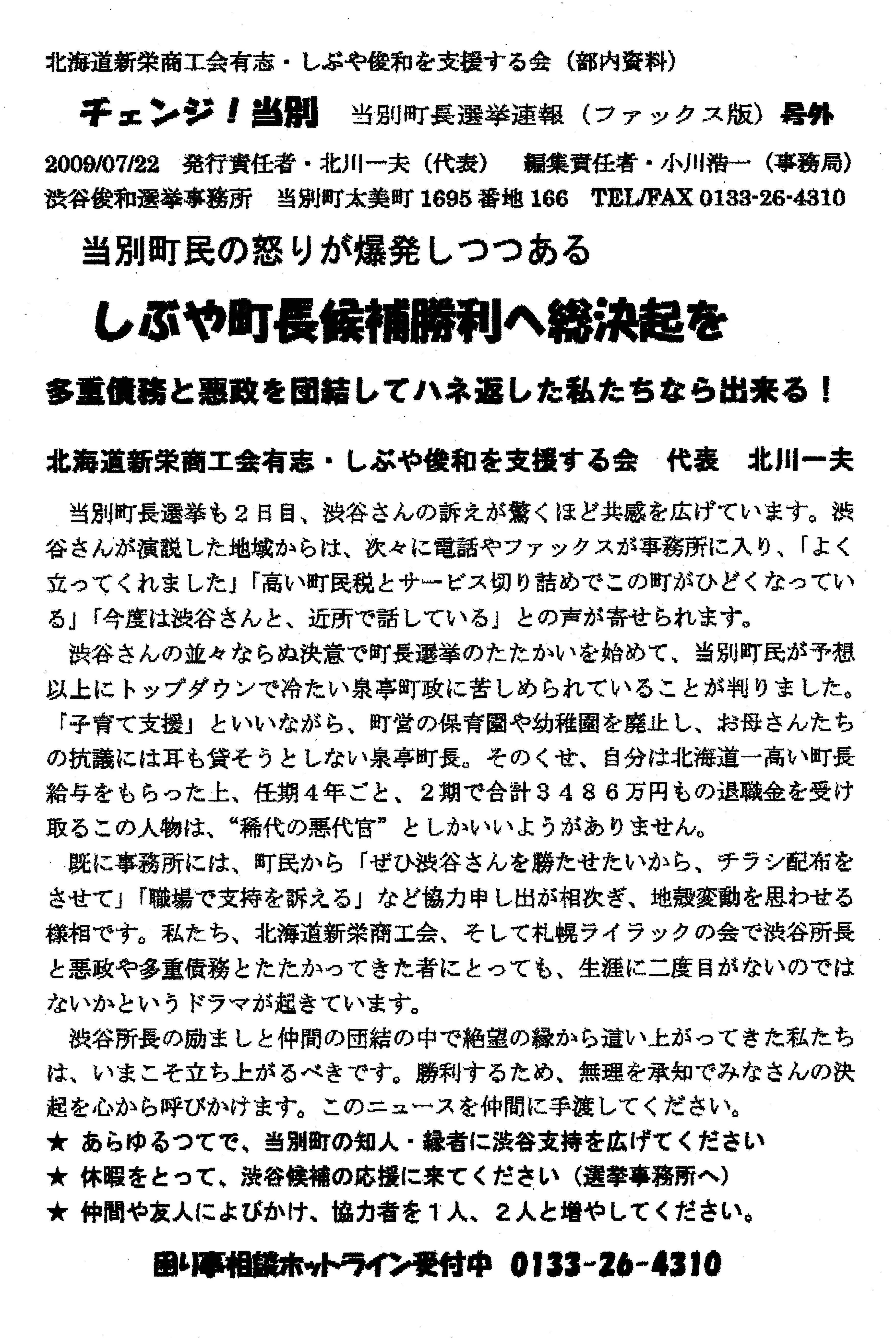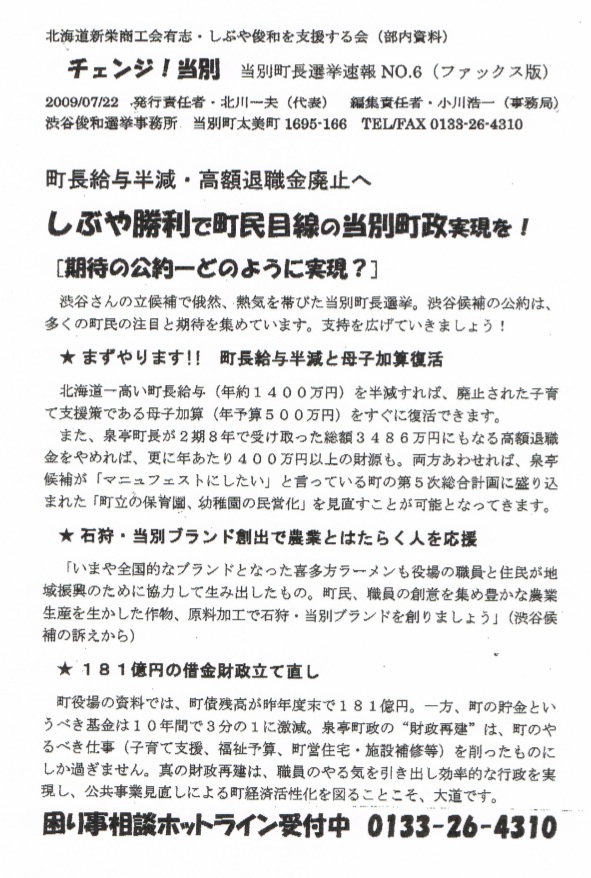 2009年07月21日 当別町長選スタート ということで、しぶや俊和を支援する会の本日の速報黒くて顔が見えないのはFAXだから、許せw起こした文章はこれ。第一声からすぐに作られた模様。いよいよスタート!当別町長選挙渋谷俊和候補に大きな期待集まる[町政も国政もチェンジへ! 筆坂秀世さんが訴え]「きょう、衆議院が解散され,政権交代が問われる総選挙に両けて政局が動き出し、当別町では町長選挙で町政刷新が問われるという町民にとって二重のチャンスがやってきました」やしきたかじんの人気テレビ番租「そこまで言って委員会」でおなじみの元参議院議員,筆坂秀世さんが語ります。「渋谷さんが立侯補を決意してくれた意義は、大きなものがあります。このまま、三期続いて無投票で町長選出では町政の停滞を招きます。大いに政策を訴え、必ず渋谷さんを当選きせて町長給与半減、母子加算復活の町民にやさしい町政を実現しようでほありませんか」筆坂さんは、今日と明日、渋谷町長候補といっしょに町内を遊説します。[人間に冷たい政治か、住民が主人公の新鮮な政治かー新党日本の副代表、有田芳生さんが連帯のメッセージ]「日本のどこにいても政治は私たちの生活に押しよせてきます。これまで通りの人間に冷たい古い攻冶を統けるのか、それとも住民の立場に立った新しい政治を創るのか—当別町是選挙の争点もそこにあります。くらしの相談35年は、しぶやさんだからできたこと。 「北海道一給与の高い町長」を打ち破り、住民が主人公の新鮮な政治をぜひ実現いたしましょう。新党日本到代表・ジャーナリスト有田芳生(ありたよしふ)」[渋谷さん、事務所前の第—声からスタート]渋谷侯補は、午前9時から選挙事務所前で開かれた出緯式での第—声からたたかいをスタートします。「町民の目腺と声を生かした町攻の実現」「農業とはたらく人を応援」「181億円の借金財政をたて直す」という公約を表明。そのためにも、「まず、北海道で一番高く、宮崎の東国原知事とぼほ同額という高い町長給与を半滅し、母子加算を復活して町民本位の町政をスタートさせます」「今日までに、多くの町民の方々から電話をいただき、あるいは町で声をかけていただきました。この期待の声に応え、エネルギーをいただき、何としても勝利したいと訴えます。●渋谷勝利で「町長給与半減」実現へ!●子育て支援拡充・仕事創出の町政を!●トップダウンから町民目線へ転換しよう!「困りごと相談ホットライン」受付中電話0133ー26−4310