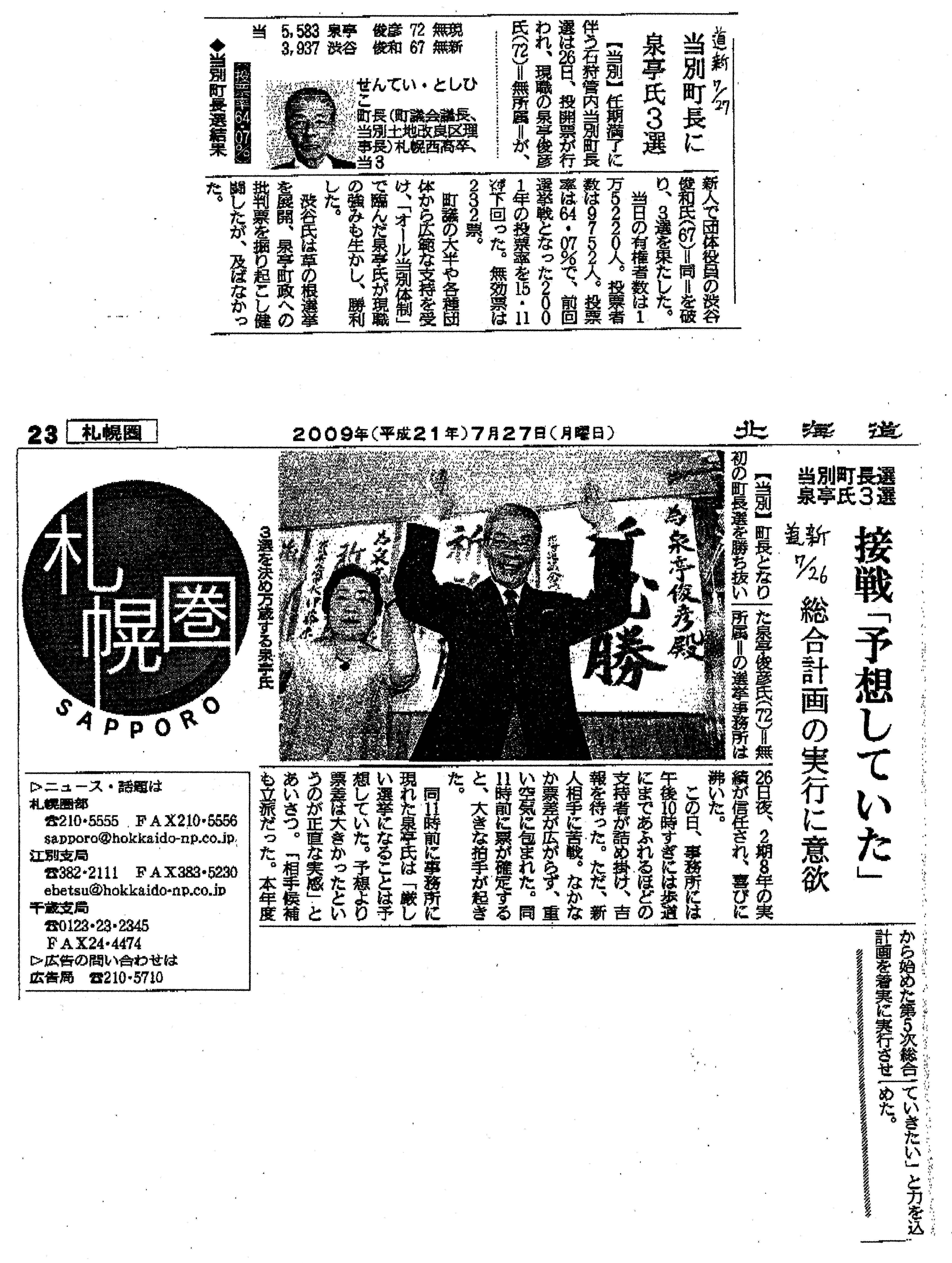 2009年07月27日 当別町長選 泉亭氏当選の報道 一夜明けて、当別町長選の新聞記事が出ている。泉亭氏の述懐「厳しい選挙になることは予想していた。予想より票差は大きかったというのが正直な実感」「相手候補も立派だった。本年度から始めた第五次総合計画を着実に実行させていきたい」かなり堪えた様子だが、まぁ三選されたのですから、まぁがんばってください。それより今回の選挙で評判を落とした日本共産党当別町委員会、現在も1議席しか町議会に議席はないが、二年後守りきれるかなw?