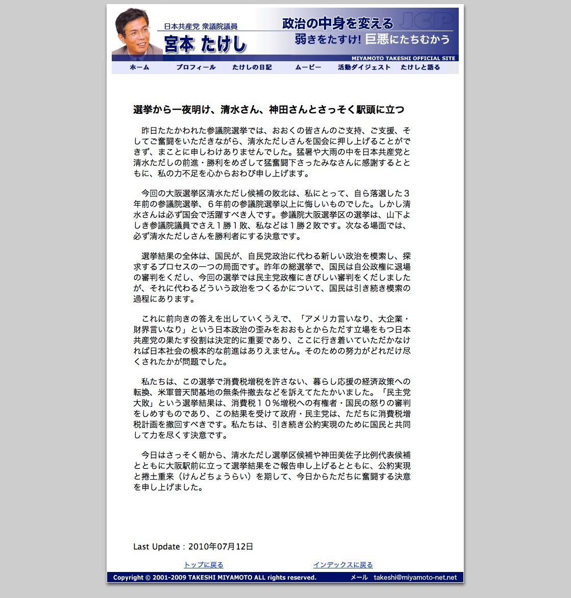 2010年07月14日 勝者がいない?だから何? ジェラルド・カーチスの言葉を報道カーチスの言うことにどうこうとは言わない。ぼくちん的には老いたなという印象を持っている(ニ大政党の溶解第二ステージが始まったというのがぼくちんの考え)が、問題はこれを赤旗が掲載したこと。日本共産党負けたけど、勝者はいませんでしたと言いたいのが見え見え。ことしは民主党並み、三年前は自民党並みで常敗したのは日本共産党である事実から目をそらせようとするような記事を今、赤旗は書くべきではない。そんなのよりも、なぜ負けたのか記者座談会でもやれば?