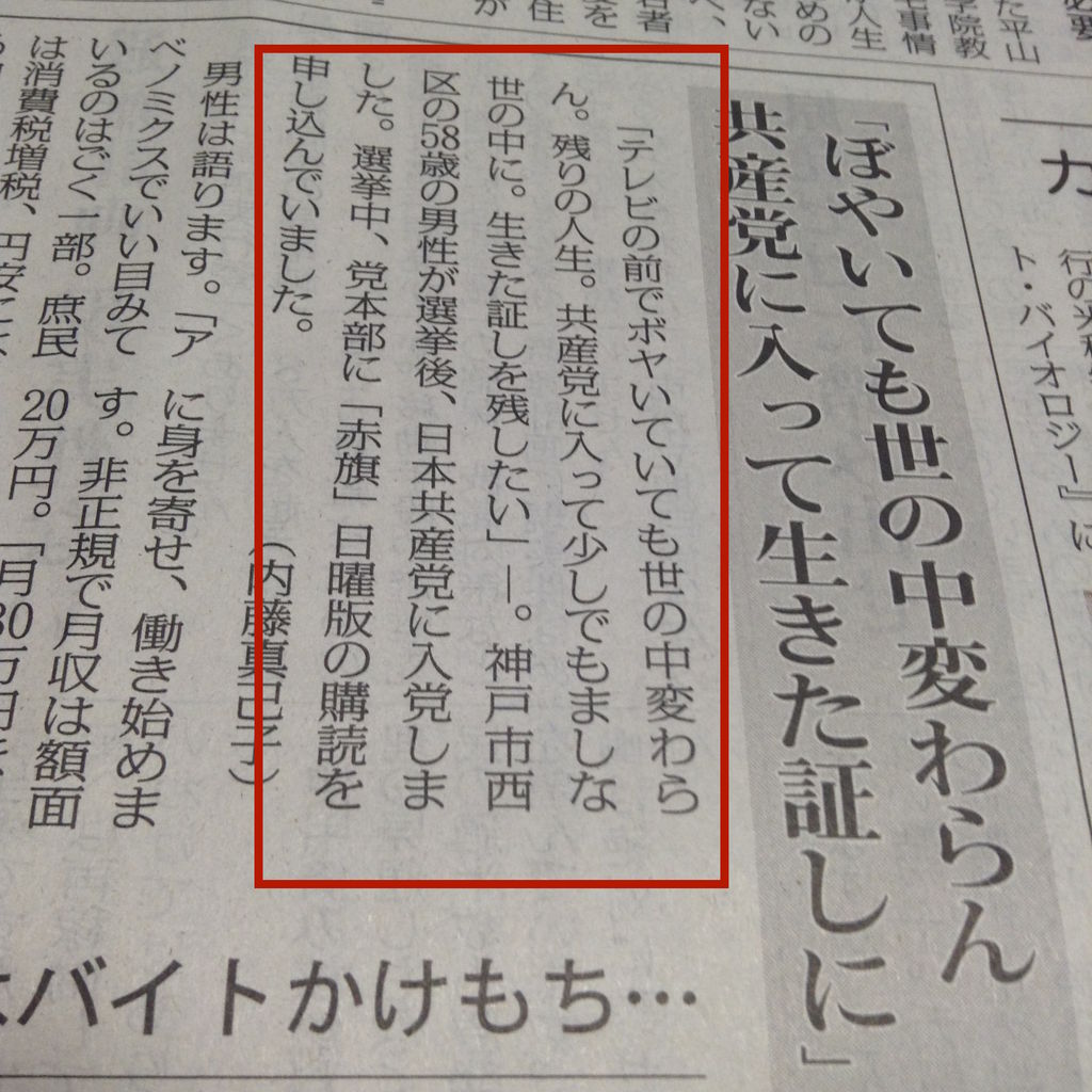 日本共産党は選挙のたびに小選挙区なら300万の供託金を国庫に供出してくれる政府にとってありがたい政党ですが、だいぶ寄付が減って国もがっかりしているでしょうというのは前振りで、公明党との一騎打ち、自民党との一騎打ちで勝った選挙区は一つもないんですが、どうしてこんな自慢げになれるんでしょう。