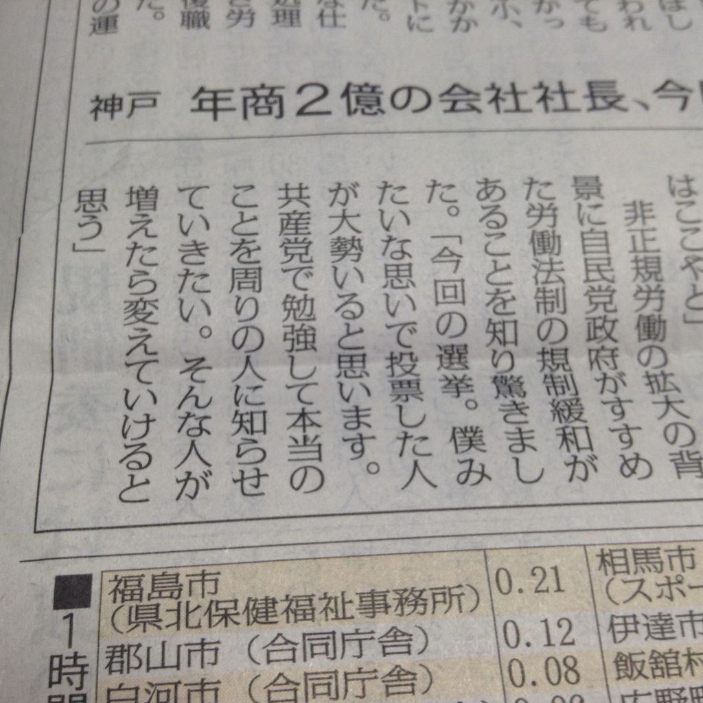 今年は、非正規雇用ばかりだとヤバいぞと考えた大企業が正社員を増やすように方針転換したり、自民党の要請に応じて社員の給料を増やそうといった試みが始まった年であった。でもそうした施策を出したユニクロとかローソンとかに共産党はほとんど話題にしていない。結局その程度の党だと言うことを露呈させてしまったね。