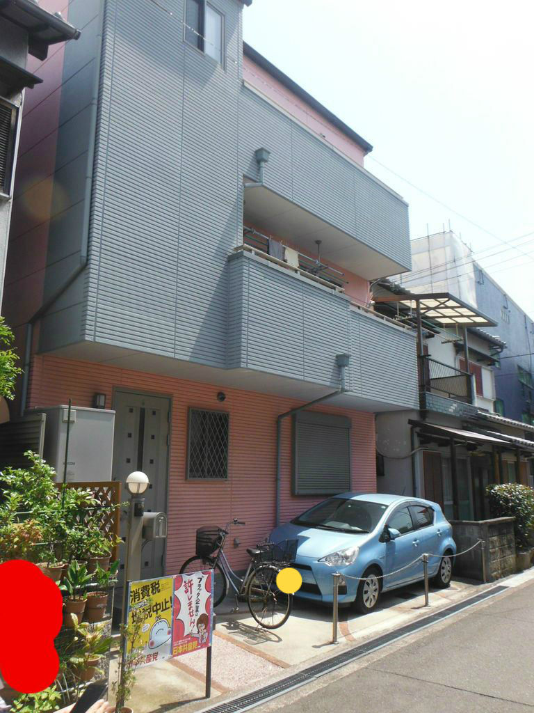 壁は経年劣化で黄色い感じに見えましたが、よく見ると外壁はもともとピンクだったようです。ここはサッシにポスターを貼ってありました。